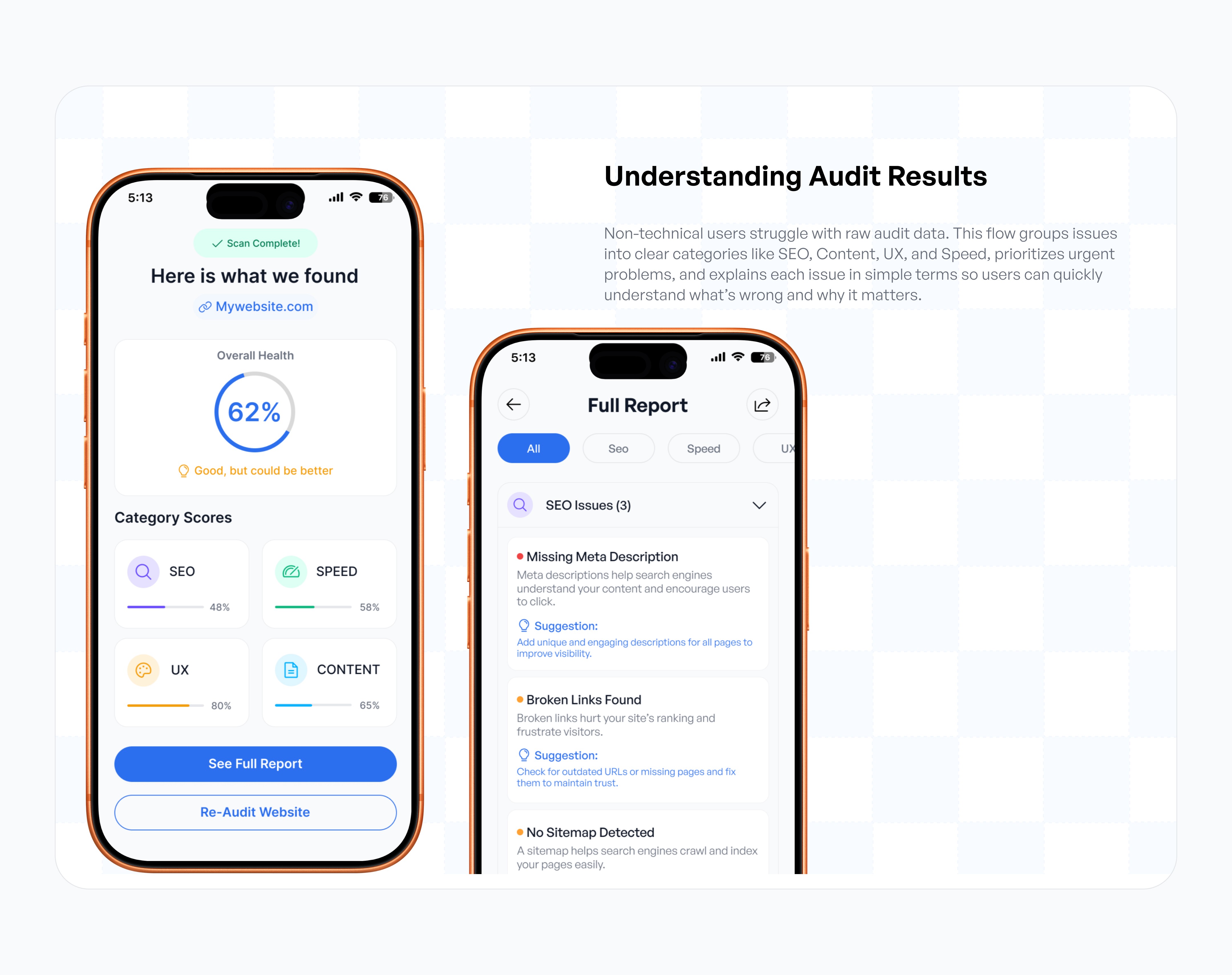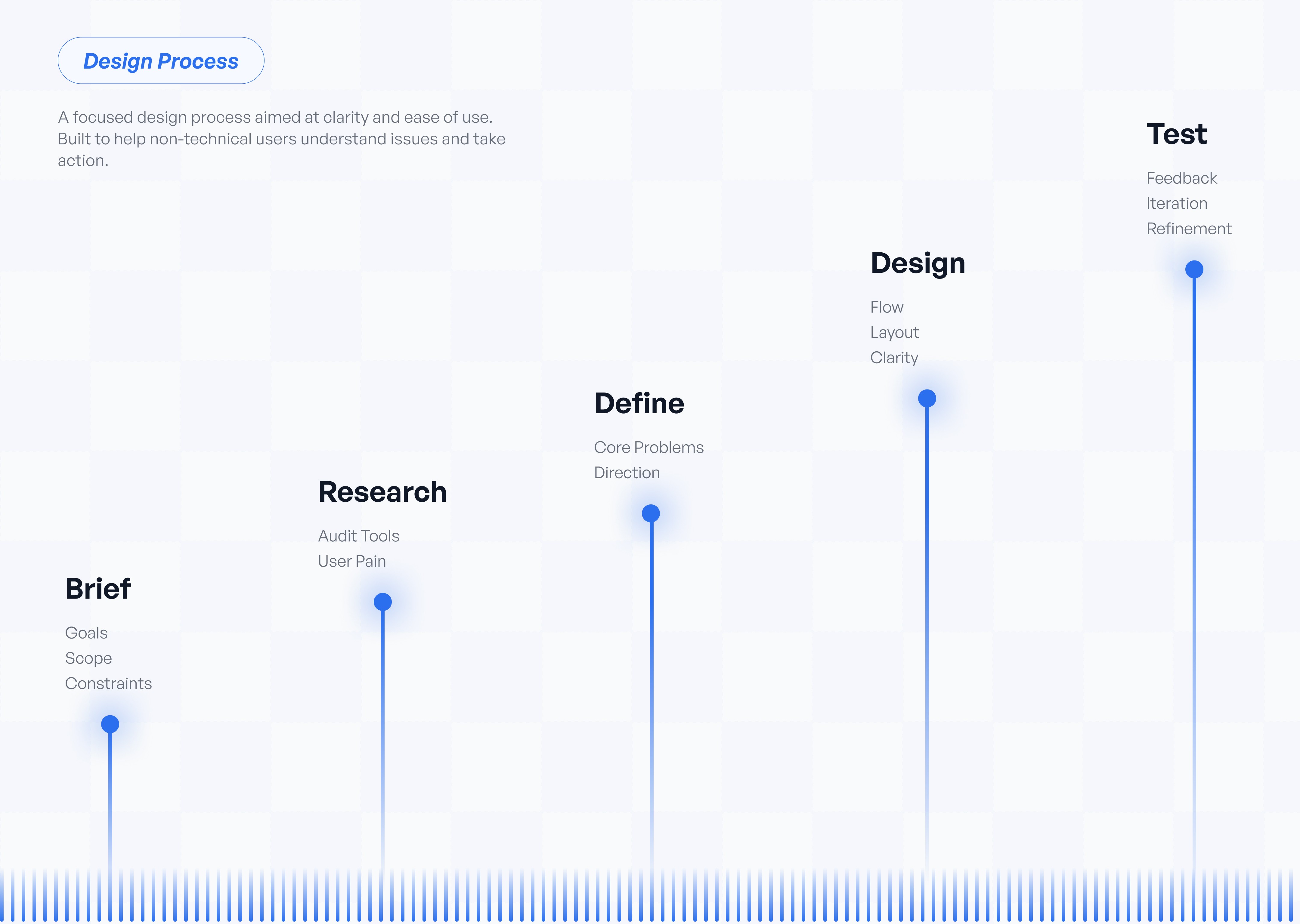 Most website audit tools present complex data that non-technical users can’t understand or act on, leading to confusion, drop-offs, and unresolved issues.