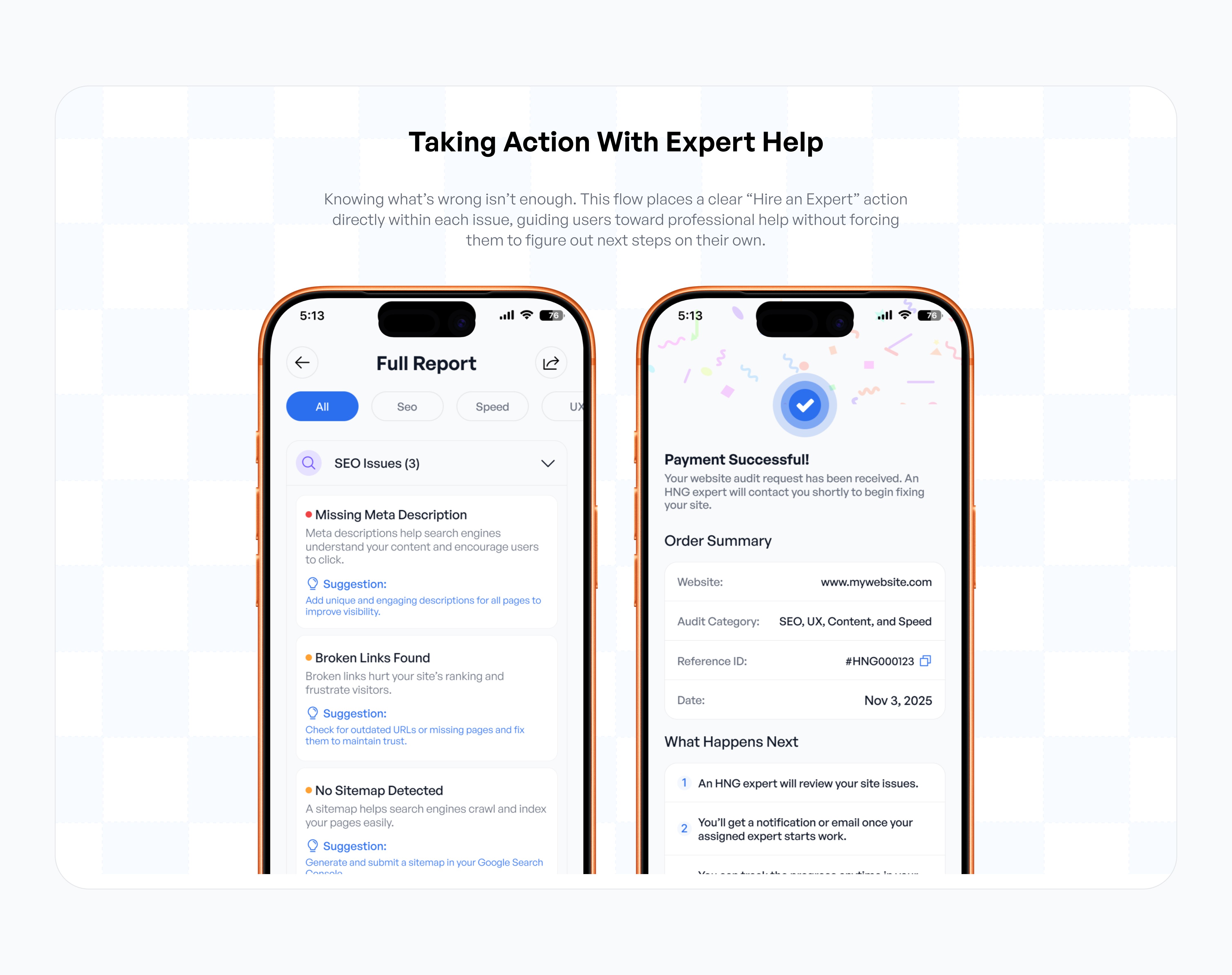 Auditly translates technical audit results into plain language, groups issues by SEO, Content, UX, and Speed, and provides a clear path to professional support through HNG.