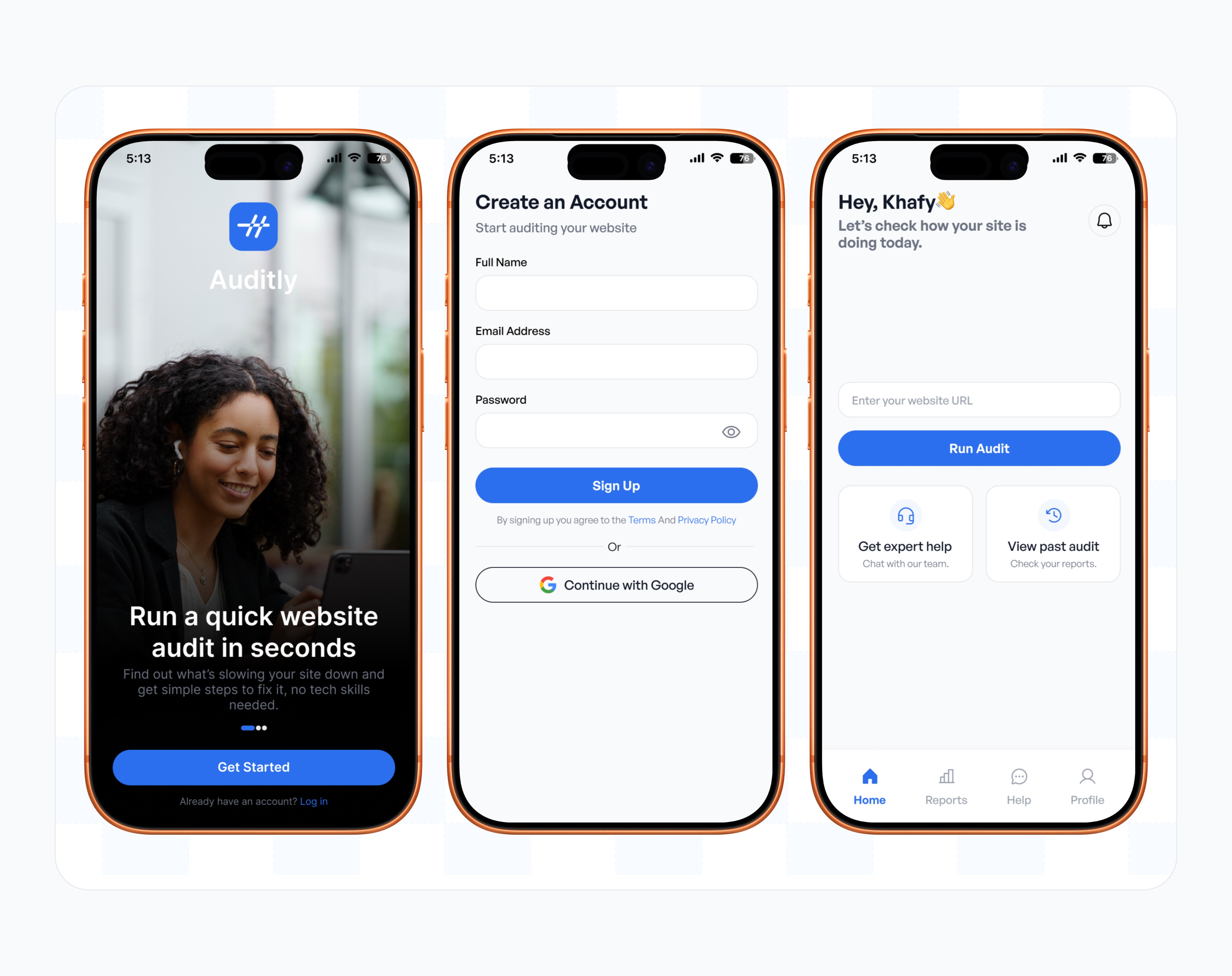 Auditly is a mobile-first website audit app designed for non-technical users who struggle to understand traditional audit tools. The app runs a site scan, breaks down issues into simple categories, and guides users toward hiring HNG experts to resolve problems efficiently.