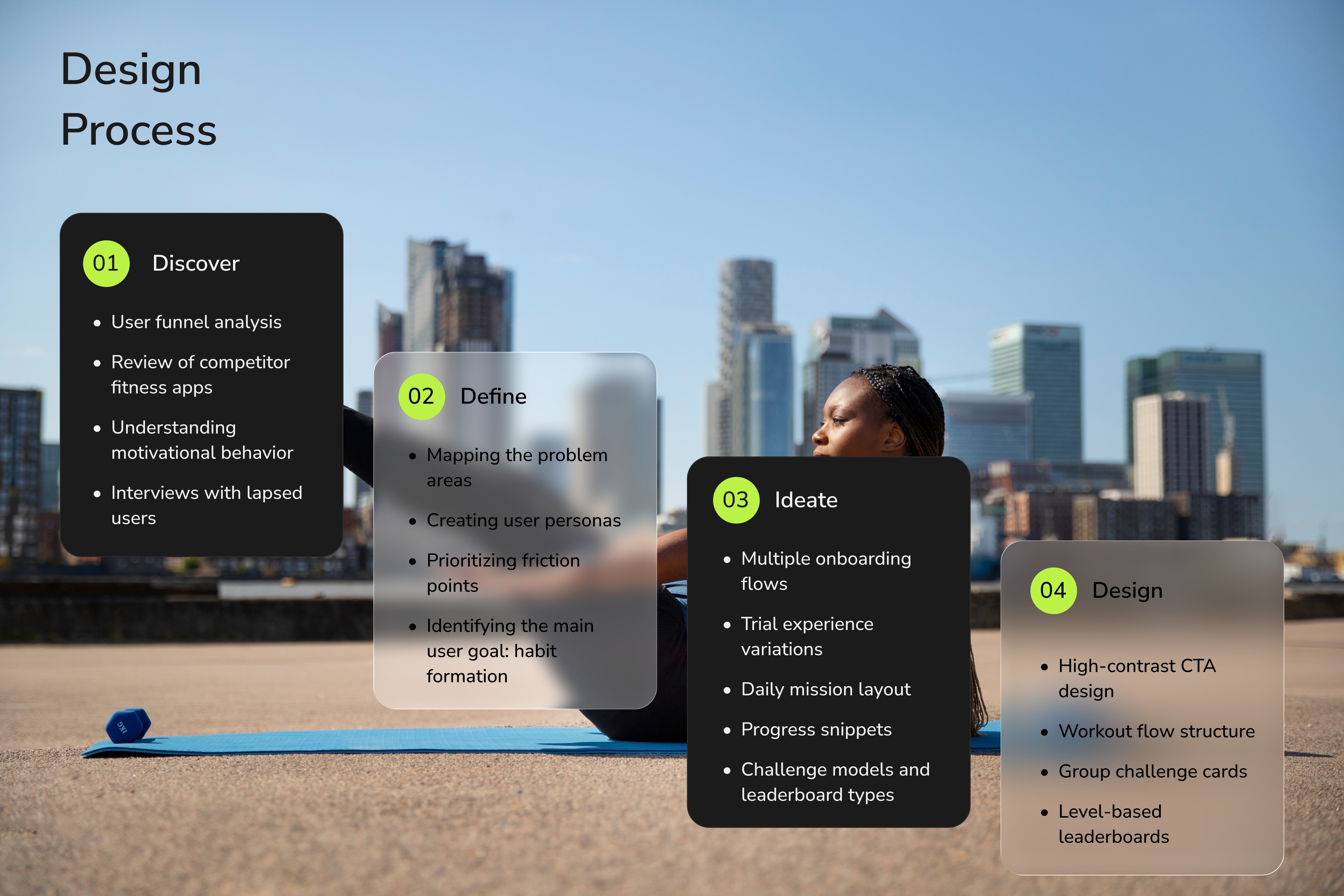 A data-informed redesign of a fitness and wellness app focused on reducing user drop-off, improving trial-to-paid conversion, and increasing long-term retention through habit-building and social accountability.