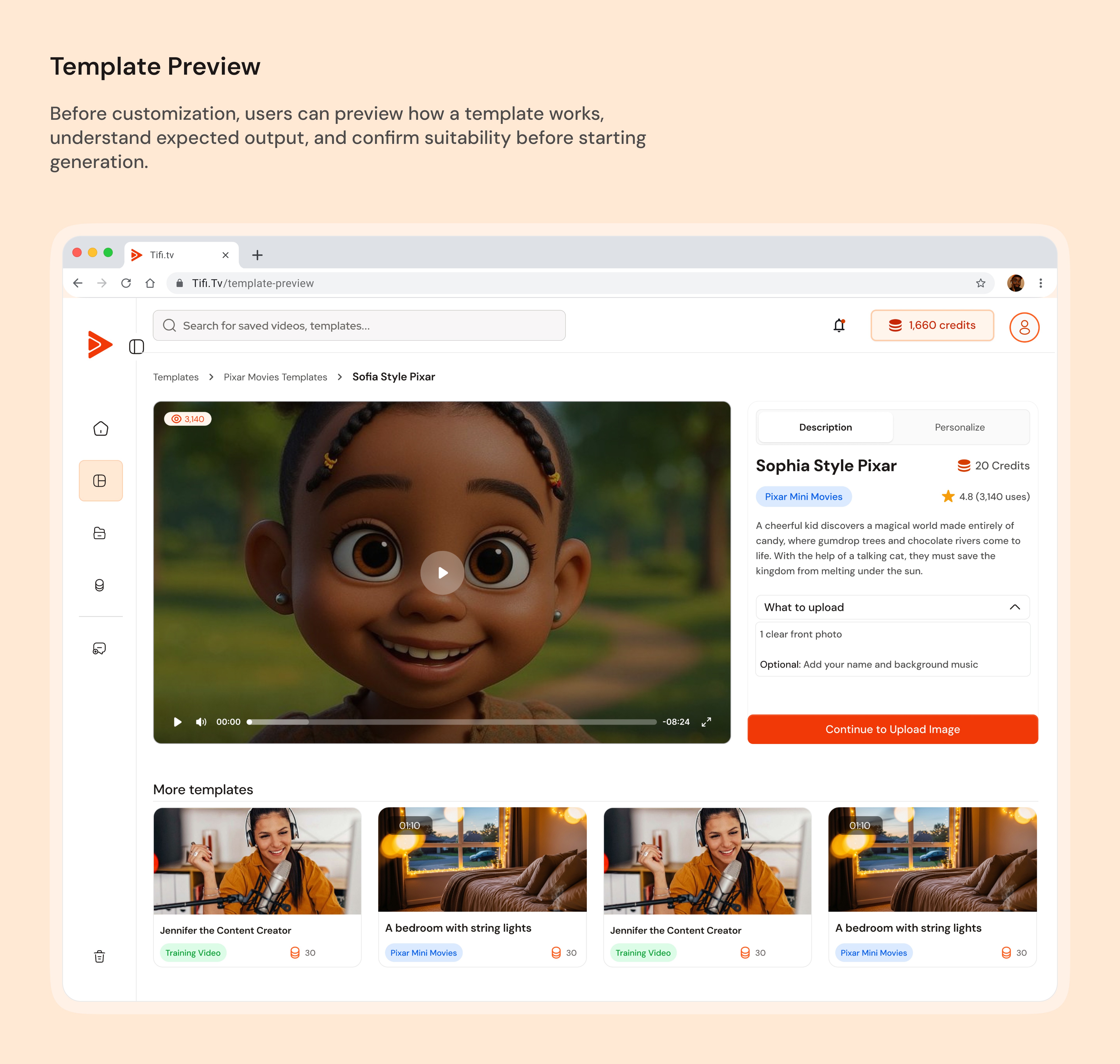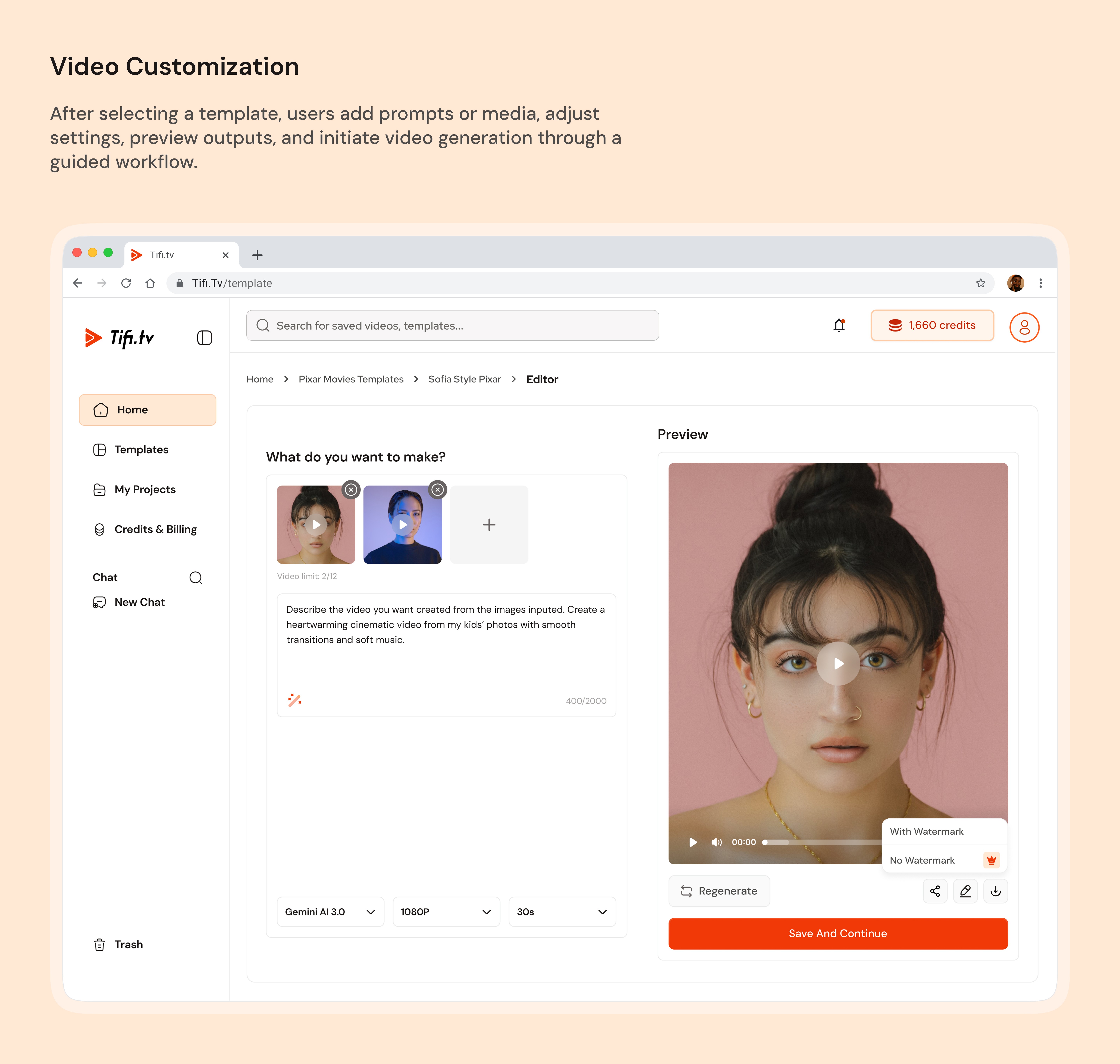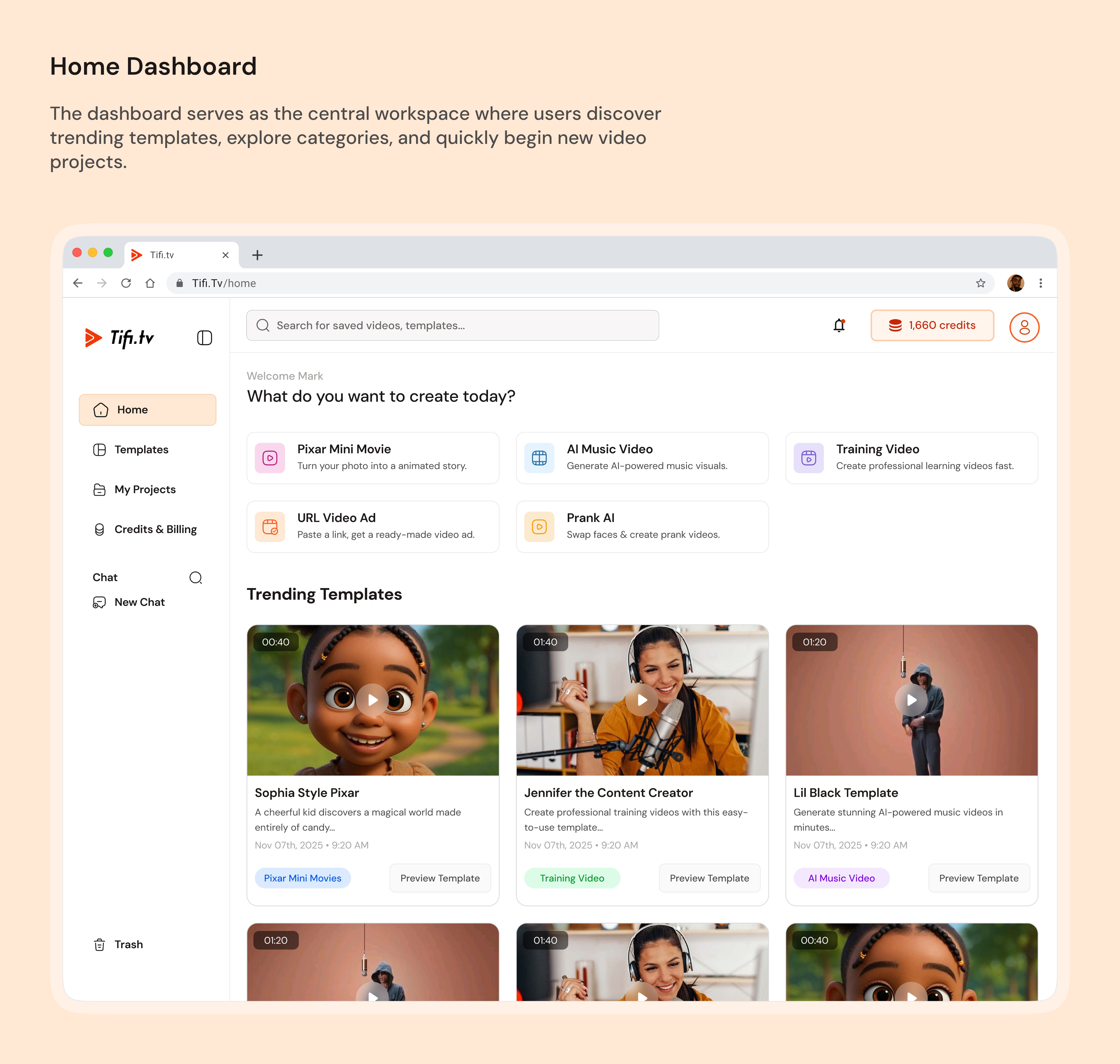 TiFi TV is a SaaS-based AI video generation platform that enables users to create videos from text prompts, images, audio, URLs, and existing videos. The goal of the project was to transform complex AI capabilities into an intuitive, scalable web experience that supports creators, marketers, educators, and startups.