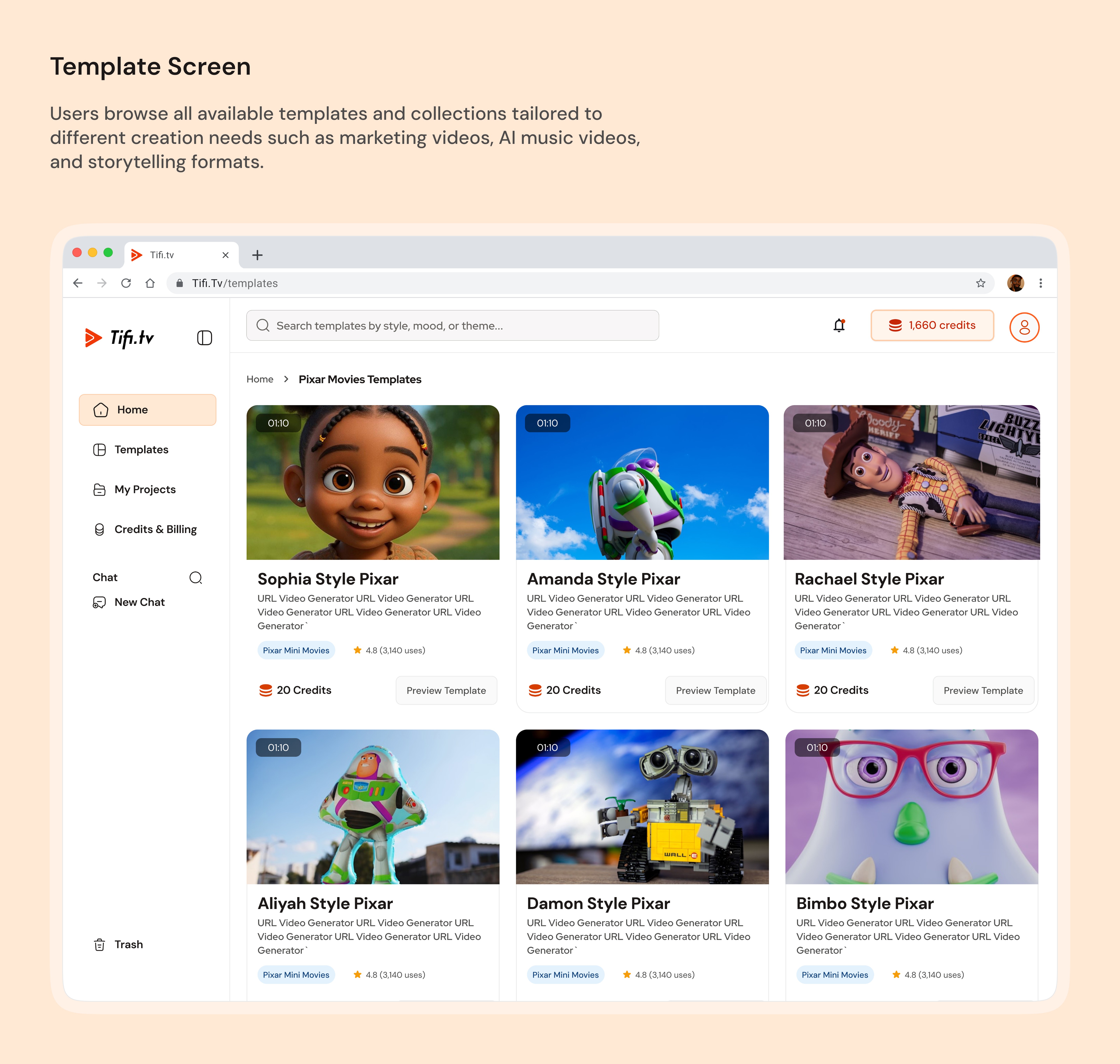Designed a guided AI-driven web platform that simplifies video creation through structured templates, automated generation workflows, and centralized project management.